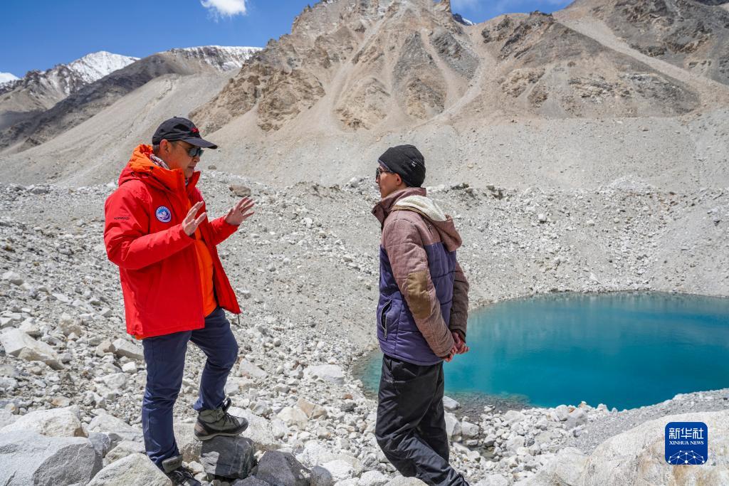 在珠峰海拔約5300米處,科考隊員在探討冰面湖的形成原因(5月14日攝)。