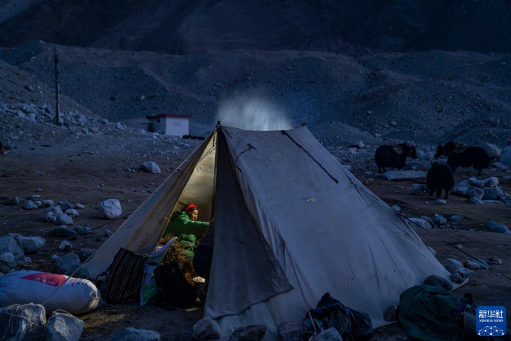馱運物資上山的前夜,牦牛工在珠峰登山大本營附近的帳篷里休息(5月17日攝)。