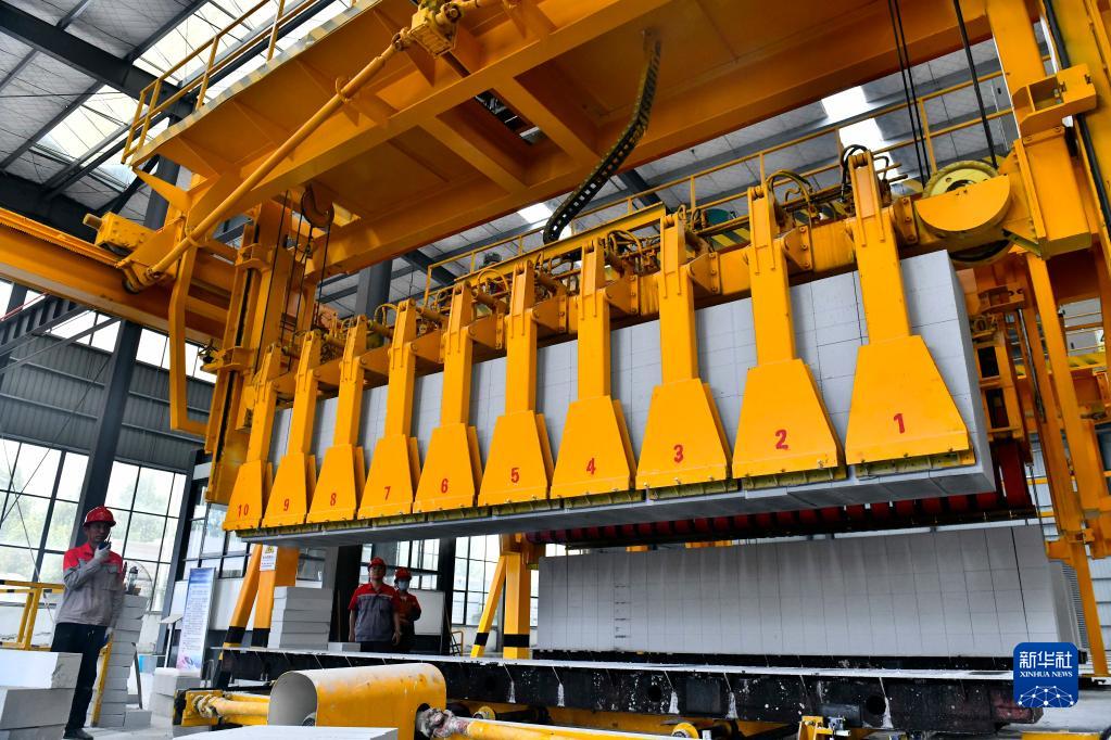 5月28日,在嘉祥縣國家級裝配式建筑產業園,工人在生產線上操作機械,加工裝配式建材混凝土砌塊。
