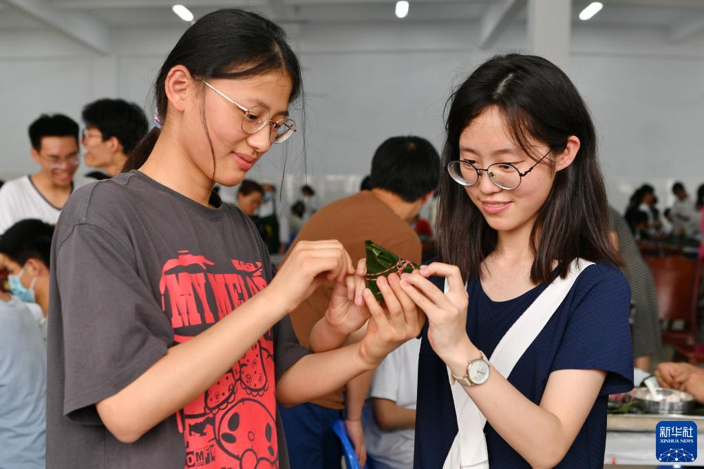 5月28日,在江蘇省常州市北郊高級中學,高三學生在包粽子。