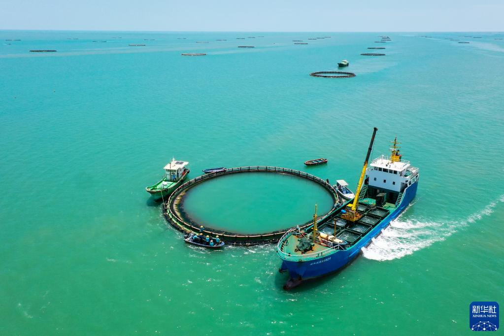 在湛江市徐聞縣西連鎮(zhèn),徐聞國橋深海養(yǎng)殖有限公司的金鯧魚深海網(wǎng)箱整齊排列(5月27日攝,無人機照片)。