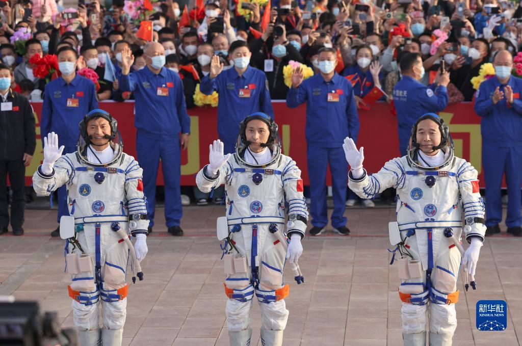 5月30日6時42分,神舟十六號載人飛行任務航天員乘組出征儀式在酒泉衛(wèi)星發(fā)射中心問天閣圓夢園廣場舉行。這是航天員景海鵬(右)、朱楊柱(中)、桂海潮在出征儀式上。