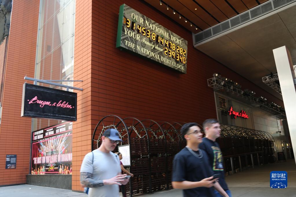 5月29日,人們經過美國紐約曼哈頓的“國債鐘”。“國債鐘”是一個大型計數器,它實時更新美國的公共債務總額,并顯示出每個美國家庭所要負擔的數額。