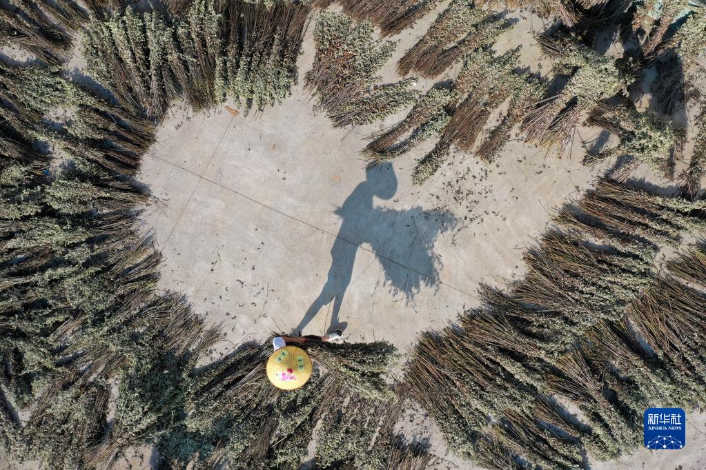 5月29日,在常寧市洋泉鎮西南村,農民在晾曬艾草(無人機照片)。