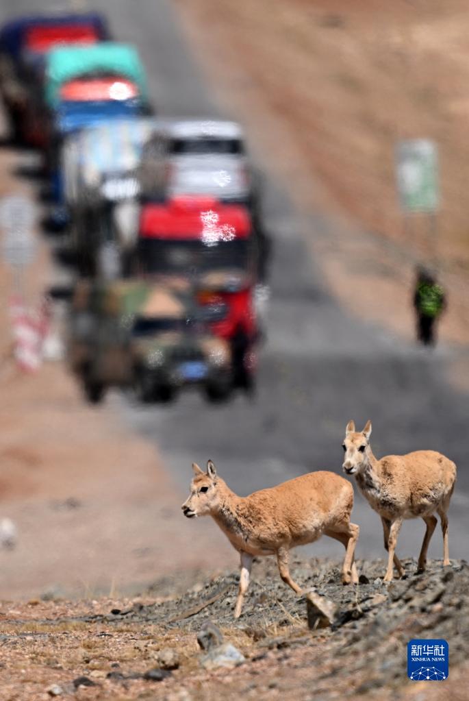 5月29日,在青海可可西里,兩只雌性待產(chǎn)藏羚羊通過青藏公路。
