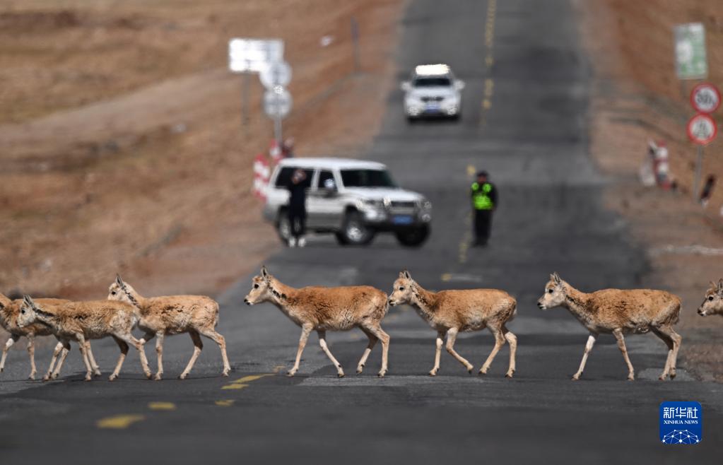 5月28日,在青海可可西里,一群雌性待產(chǎn)藏羚羊通過(guò)青藏公路。