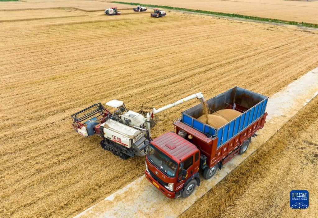 近日,江蘇省泰州市255萬畝小麥陸續進入收割期,當地農民搶抓晴好天氣加緊收割。農機在田間穿梭,構成了一幅美麗的豐收圖畫。