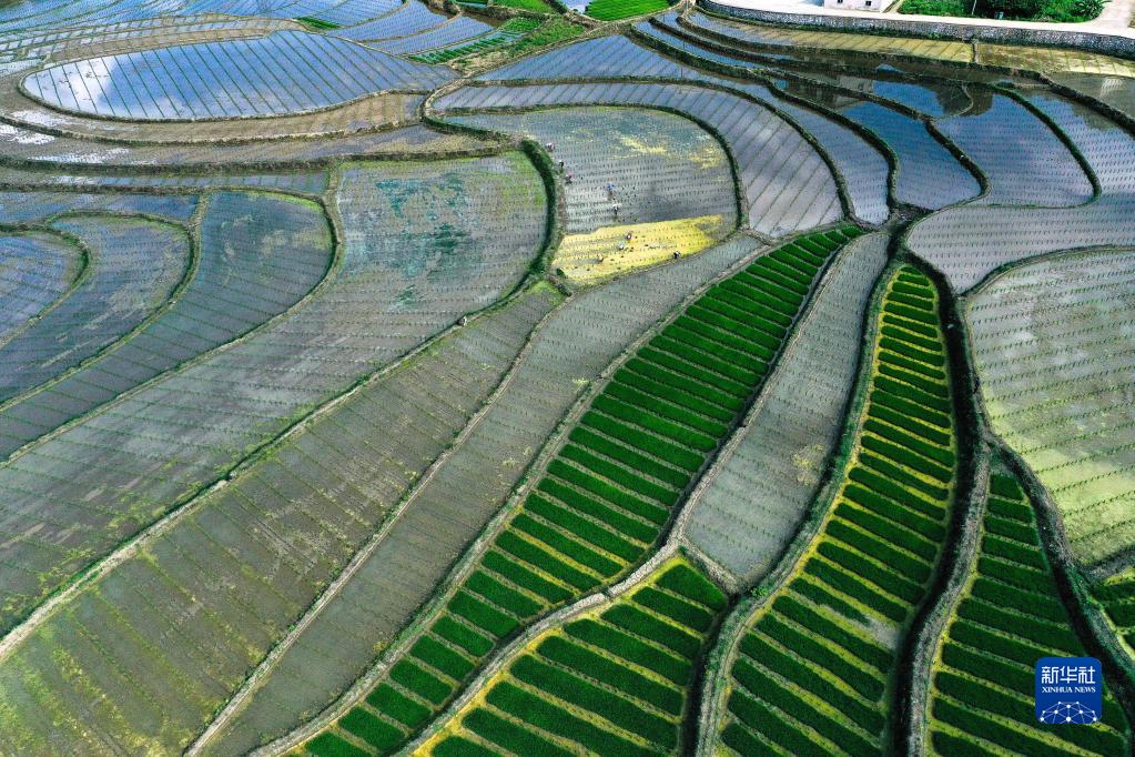 5月29日,村民在岑鞏縣水尾鎮新場村的雜交水稻制種基地移栽制種水稻秧苗(無人機照片)。