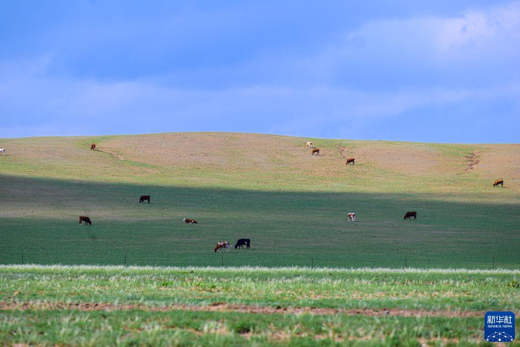 5月30日,牛群在內蒙古錫林郭勒盟蘇尼特右旗境內的草原上悠閑覓食。