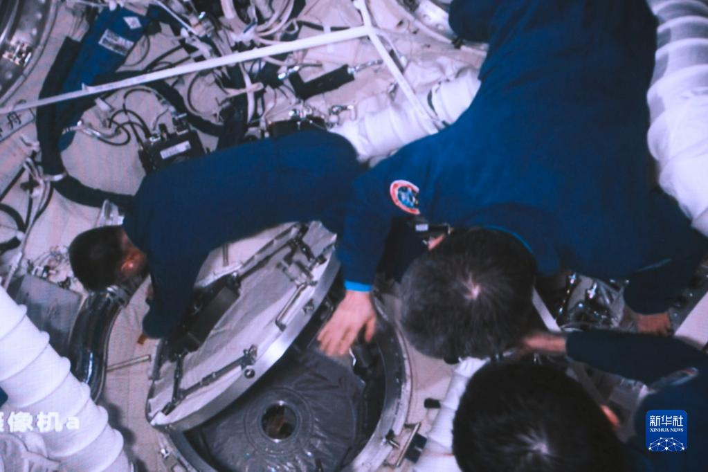 5月30日在北京航天飛行控制中心拍攝的神舟十五號航天員乘組打開天和核心艙氣閘艙徑向艙門并向神舟十六號航天員乘組揮手致意的畫面。