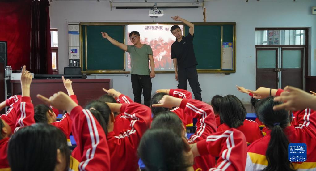 5月30日,在安達市任民鎮中心小學,音樂老師李平(右)和張雨在教室內指導音樂班的孩子們練習唱歌。