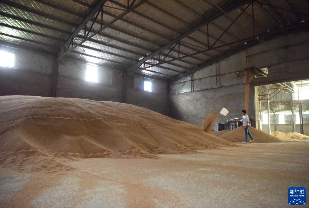 5月30日,在河南省駐馬店市正陽縣大林鎮一家烘干加工合作社,工作人員在堆放烘干后的小麥。