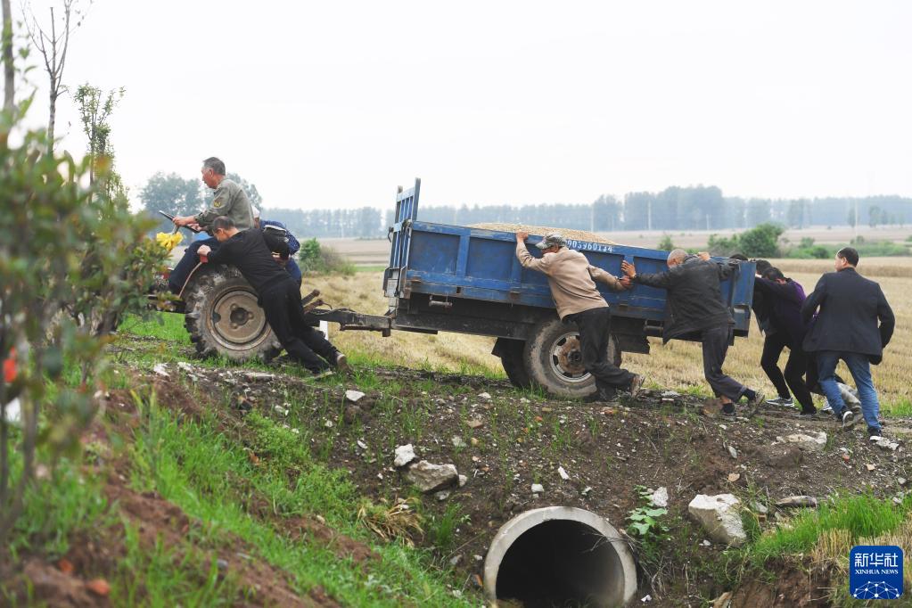 5月30日,在河南省駐馬店市正陽縣銅鐘鎮,村民在幫忙推車,車里裝著剛收獲的小麥。
