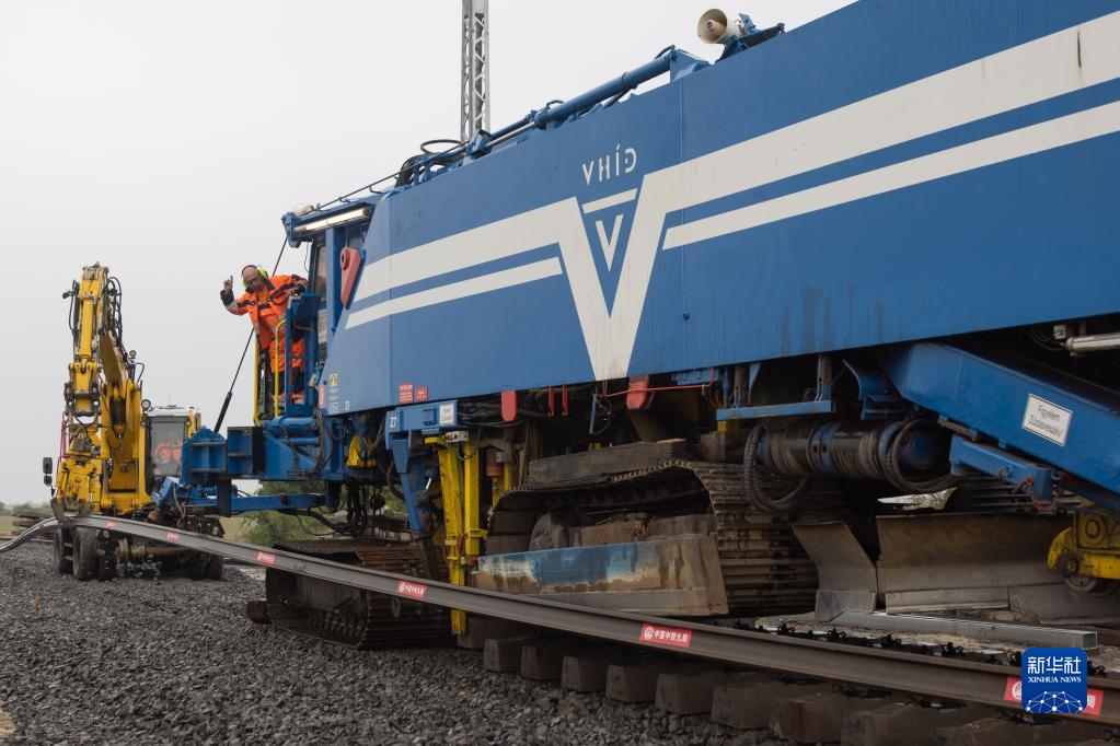 5月30日,在匈塞鐵路匈牙利段孔圣米克洛什-陶什站施工現(xiàn)場,工作人員操作機(jī)械鋪設(shè)鋼軌。