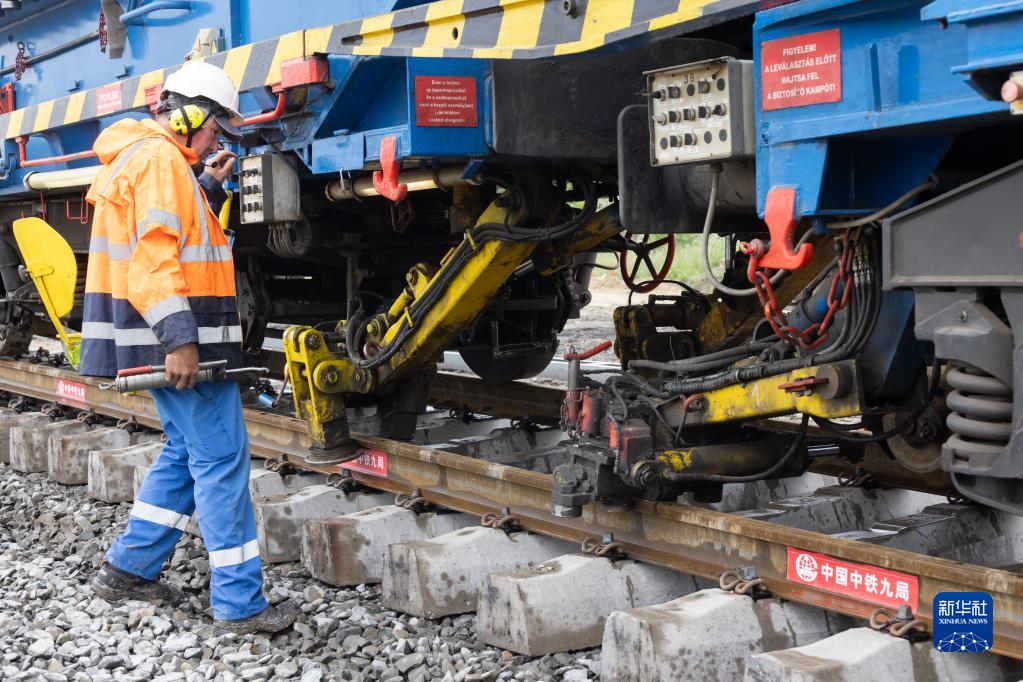 5月30日,在匈塞鐵路匈牙利段孔圣米克洛什-陶什站施工現(xiàn)場(chǎng),工作人員調(diào)整鋪軌機(jī)作業(yè)狀態(tài)。