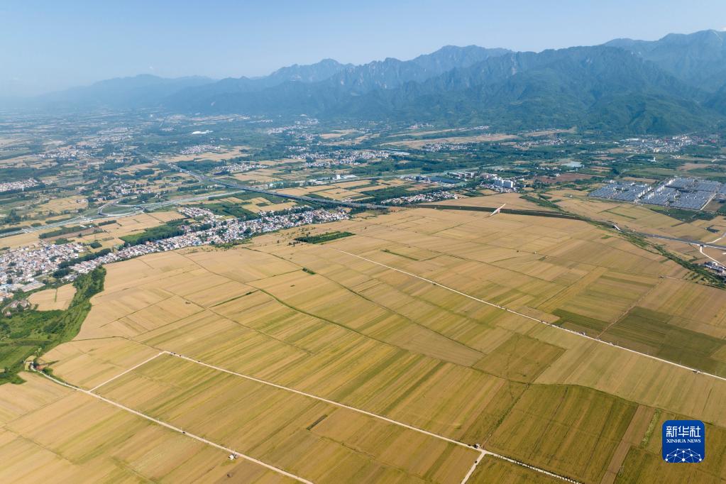 西安市長安區神禾塬萬畝優質糧食生產基地上陸續成熟的麥田(5月30日攝,無人機照片)。