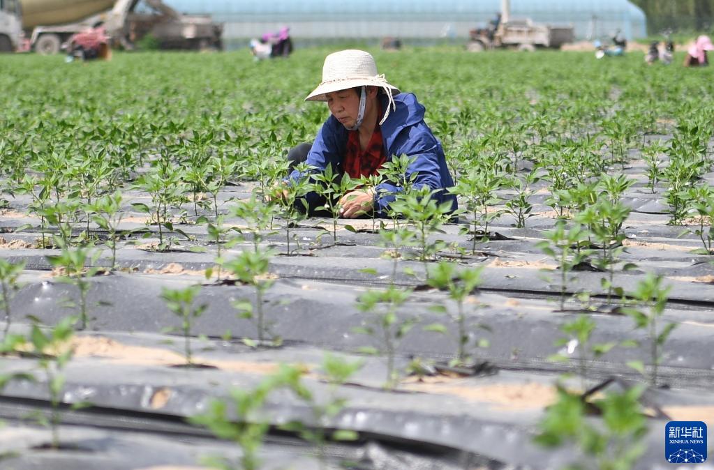 6月1日,河北雄安新區安新縣陽雀湖西里現代農業產業園區工人在管護辣椒秧苗。