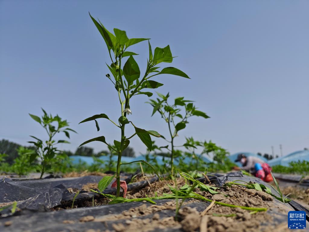 6月1日,河北雄安新區(qū)安新縣陽(yáng)雀湖西里現(xiàn)代農(nóng)業(yè)產(chǎn)業(yè)園區(qū)工人在管護(hù)辣椒秧苗。