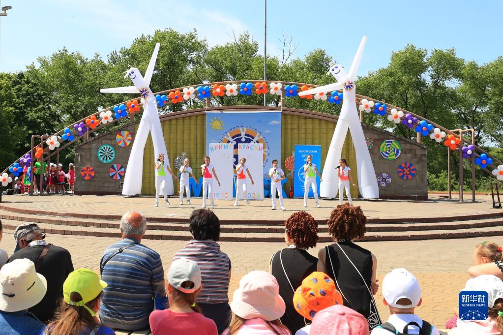 6月1日,孩子們?cè)诎锥砹_斯首都明斯克表演節(jié)目,慶祝“六一”國(guó)際兒童節(jié)。