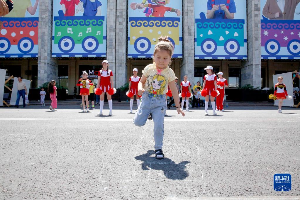 6月1日,一名女孩在吉爾吉斯斯坦首都比什凱克阿拉套廣場玩“跳房子”游戲,慶祝“六一”國際兒童節。
