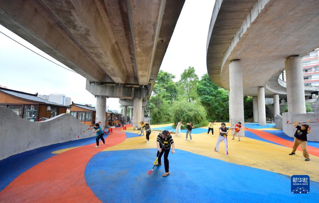6月1日,居民在宣恩縣一處立交橋下建設的健身場地休閑。