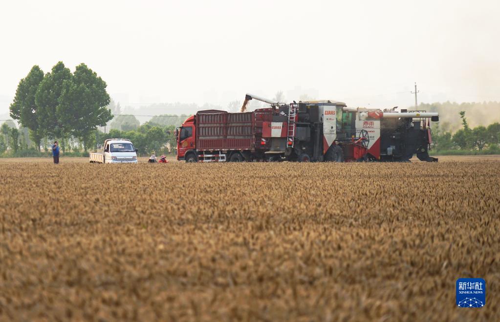 6月1日,在河南省駐馬店市上蔡縣邵店鎮后楊村,收割機在搶收小麥。新華社記者 劉振坤 攝