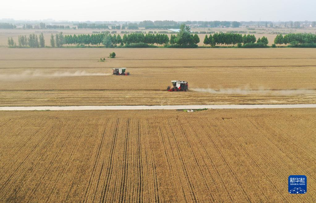 6月1日,在河南省駐馬店市上蔡縣邵店鎮(zhèn)后楊村,收割機(jī)在搶收小麥(無人機(jī)照片)。新華社記者 張浩然 攝