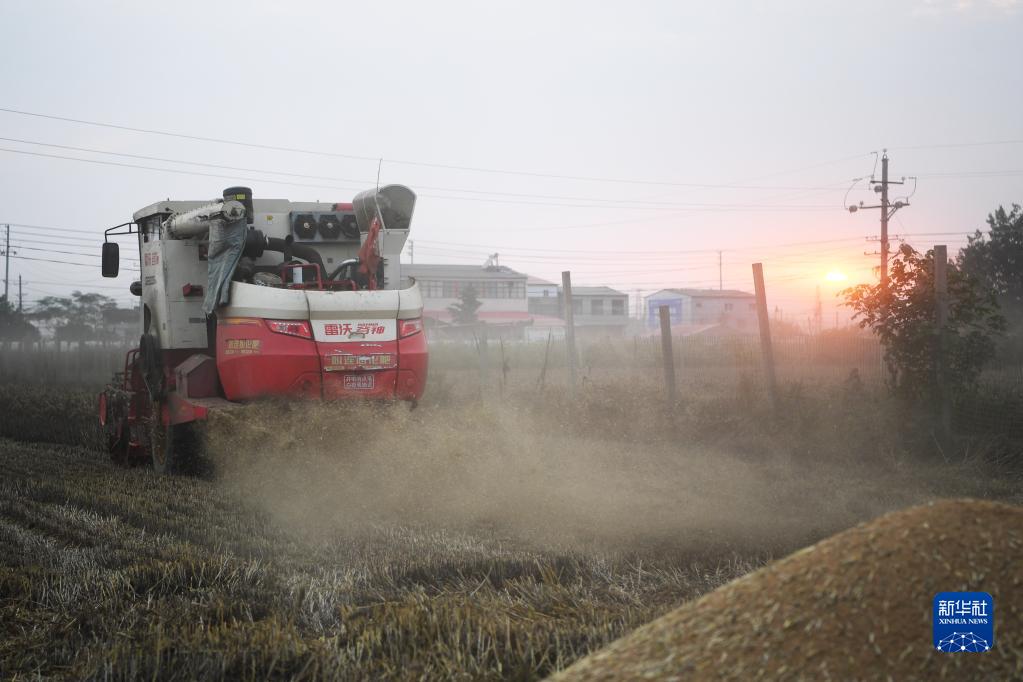 6月1日,在河南省駐馬店市上蔡縣邵店鎮劉岳村,收割機在搶收小麥。新華社記者 張浩然 攝