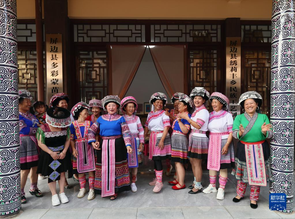 6月1日,繡娘在屏邊繡莉豐鄉民族工藝制品廠門前合影。
