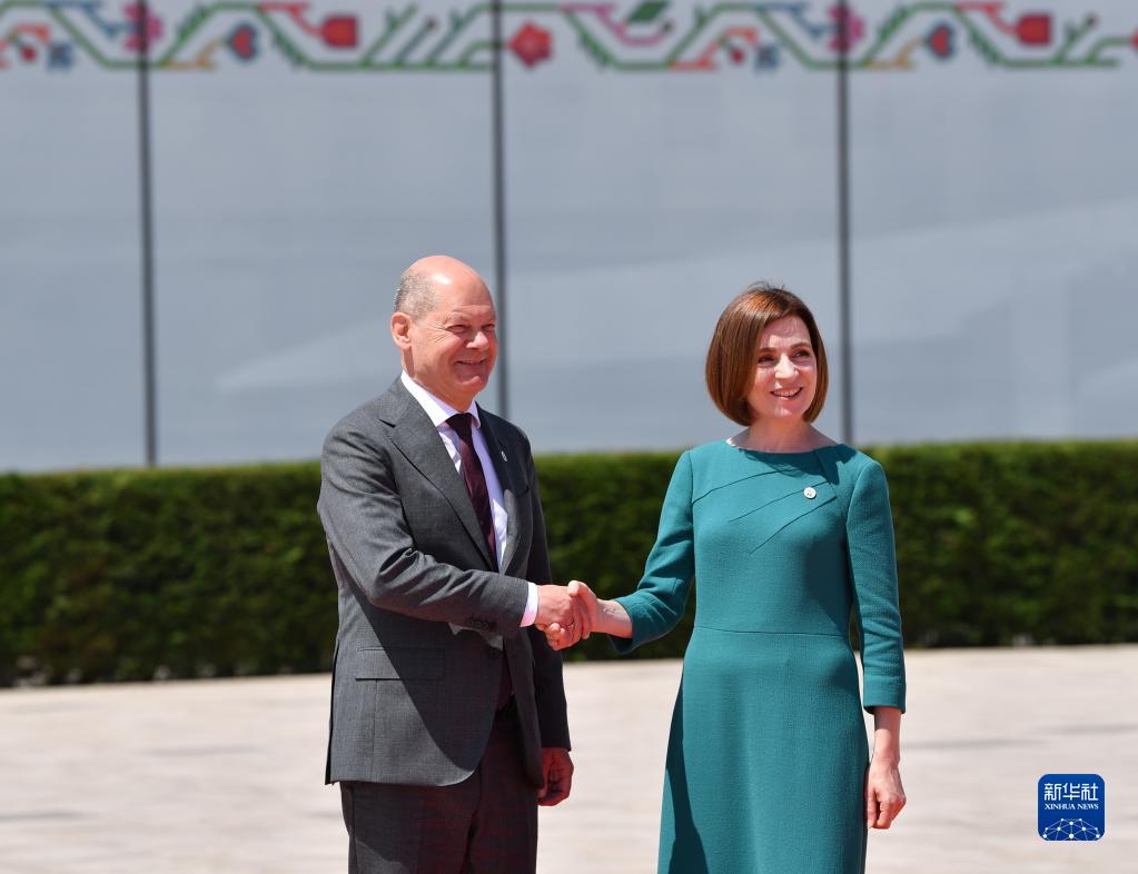 6月1日,在摩爾多瓦布爾博阿克,摩爾多瓦總統(tǒng)桑杜(右)歡迎前來(lái)參加第二屆歐洲政治共同體領(lǐng)導(dǎo)人會(huì)議的德國(guó)總理朔爾茨。