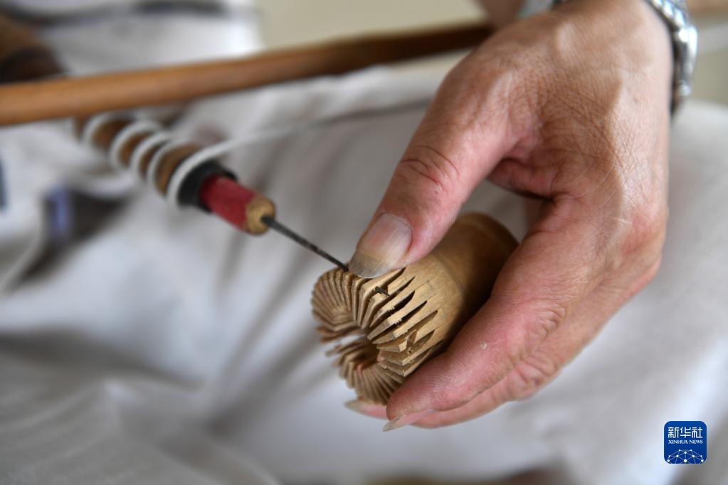 6月1日,在廣西賓陽縣賓州鎮(zhèn)陸村,陸云崗在給木頭打孔準(zhǔn)備制作油紙傘。