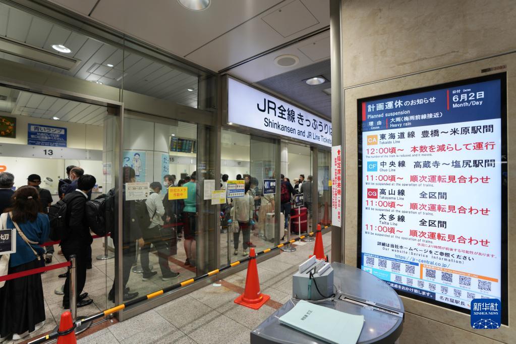 6月2日,人們在日本名古屋排隊購買車票,屏幕上顯示著當日停運列車。