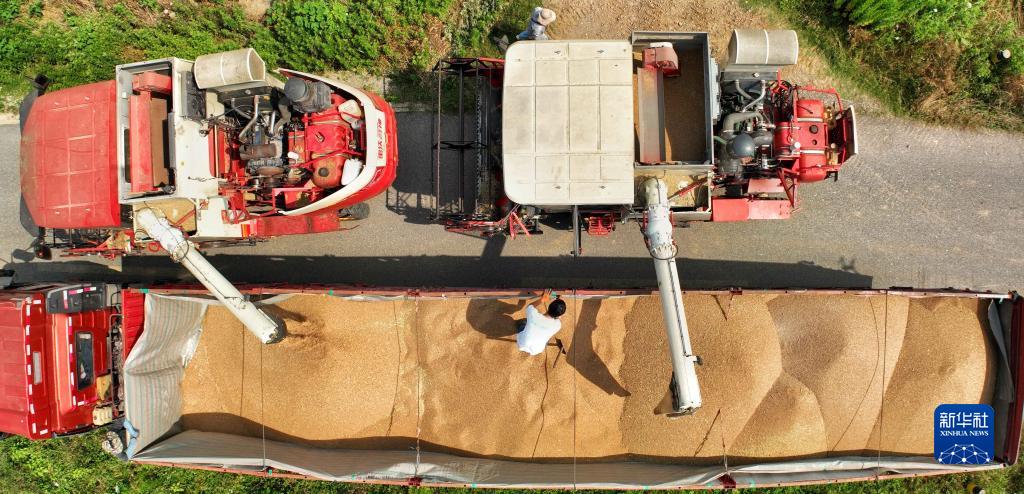 6月2日,在合肥市蜀山區小廟鎮段沖村,收割機將小麥裝車(無人機照片)。