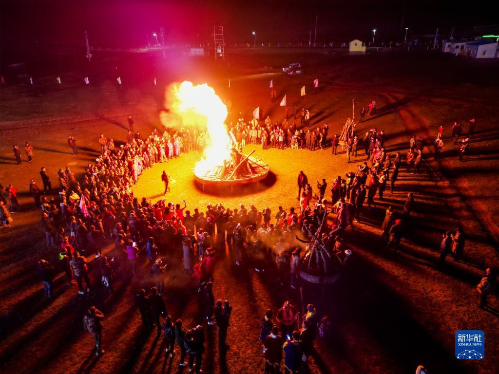 游客在新疆和田策勒縣板蘭格景區(qū)舉辦的一場篝火晚會上載歌載舞(5月30日攝,無人機照片)。