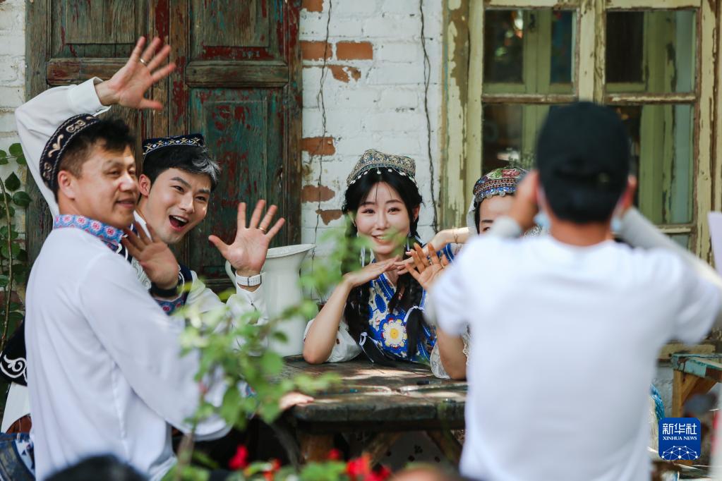 在新疆伊寧市六星街景區,游客拍照留念(5月17日攝)。