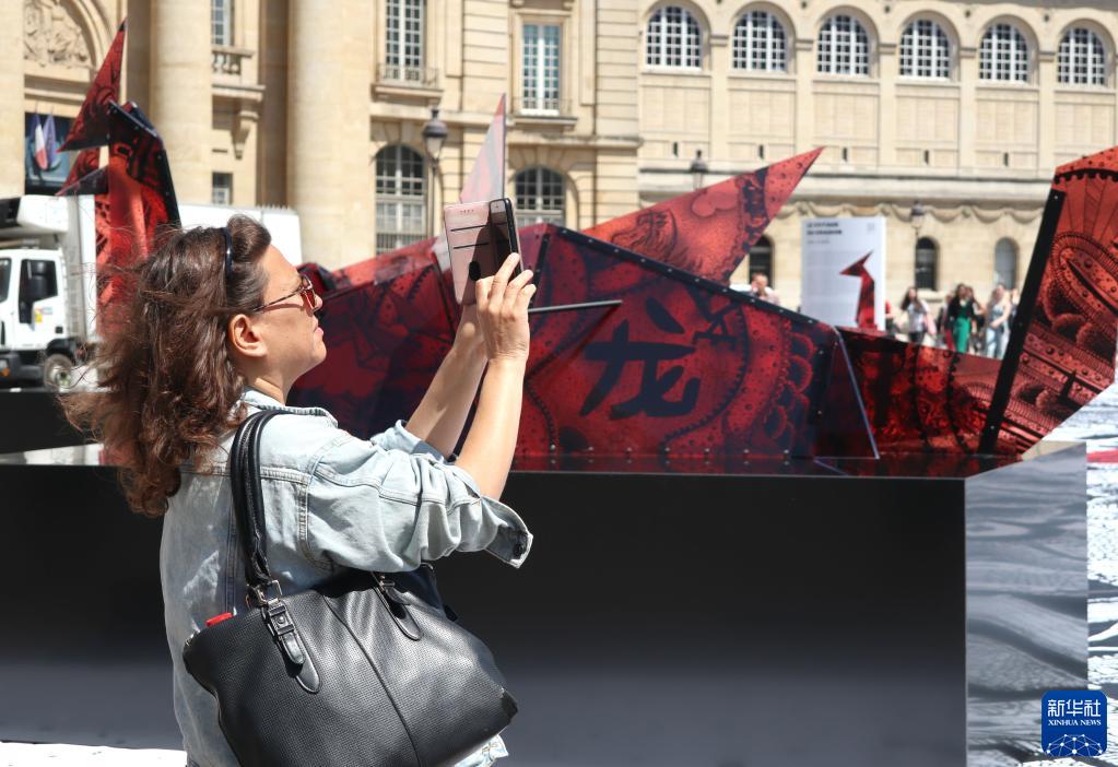 6月1日,游客在法國(guó)巴黎先賢祠廣場(chǎng)“龍的旅程”大型藝術(shù)展前拍照。