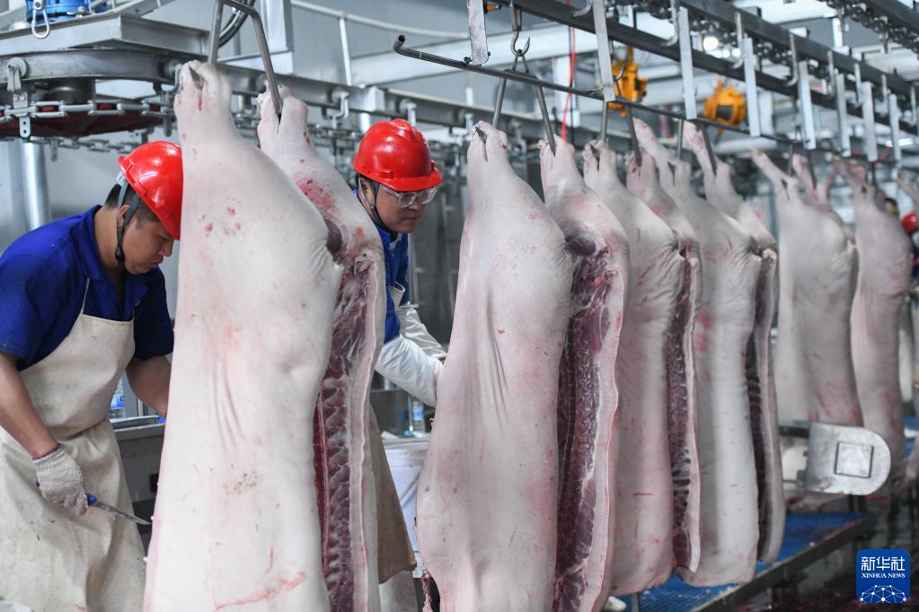 在黑龍江省鐵力市的18萬頭生豬屠宰項(xiàng)目生產(chǎn)線上,工作人員在作業(yè)(6月1日攝)。