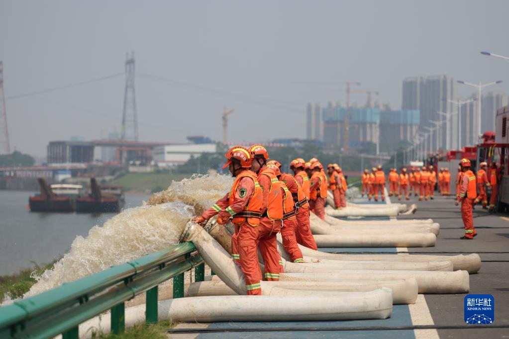 6月2日,在水域救援實戰演習現場,消防救援人員在湘江邊模擬內澇排水。
