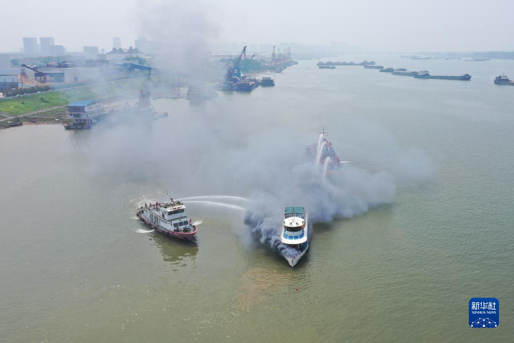 6月2日,在水域救援實戰演習現場,消防救援人員駕駛消防艇在模擬水上滅火行動(無人機照片)。