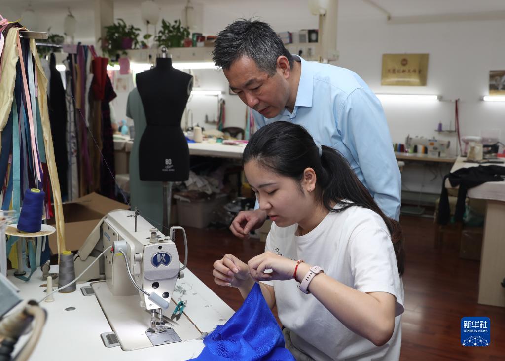 5月31日,江滿宗(后)在上海市“龍鳳旗袍制作技藝——國家級非物質文化遺產傳習所”為徒弟吳雨婷傳授技藝。