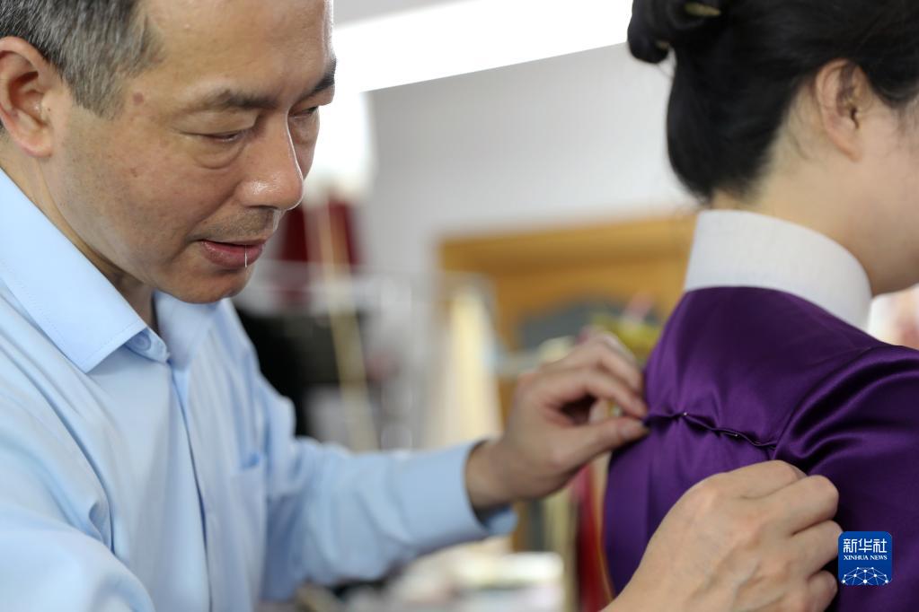 5月31日,江滿宗(左)在上海市“龍鳳旗袍制作技藝——國家級非物質文化遺產傳習所”為顧客測量身材尺寸。