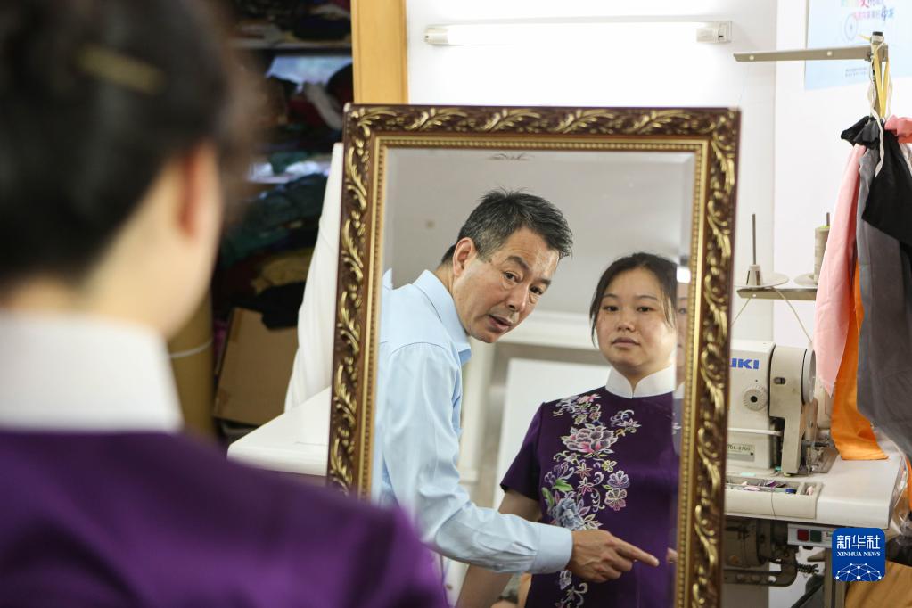 5月31日,江滿宗(左)在上海市“龍鳳旗袍制作技藝——國家級非物質文化遺產傳習所”為顧客測量身材尺寸。