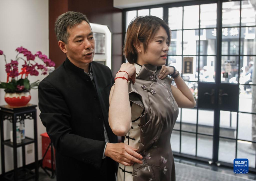 5月30日,江滿宗(左)在上海市“龍鳳旗袍”門店為顧客挑選旗袍。