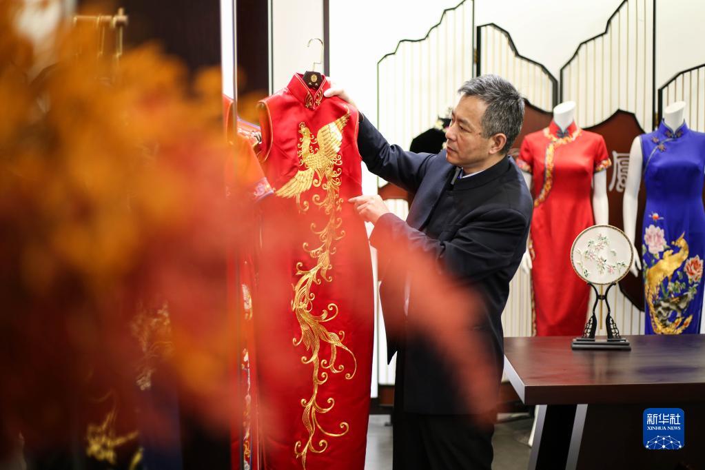 江滿宗出生于1966年,是“龍鳳旗袍手工制作技藝”第四代傳承人和傳播者。他曾多次帶領徒弟走進社區、學校等地,代表企業參加大型展會,培養年輕人對旗袍文化的興趣,向海內外觀眾展示龍鳳旗袍的魅力。如今,他的兩位徒弟張欽瑋和吳雨婷已成為“龍鳳旗袍”技藝的第五代傳承人。