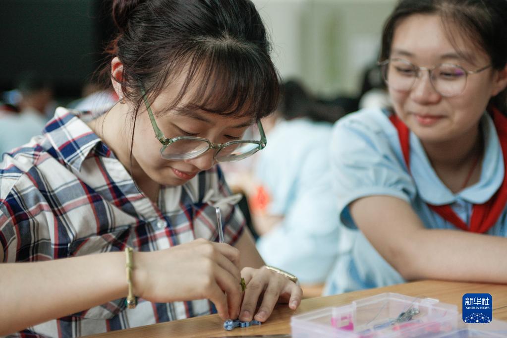 5月30日,張欽瑋(左)在上海市青云中學(xué)教學(xué)生做盤扣。