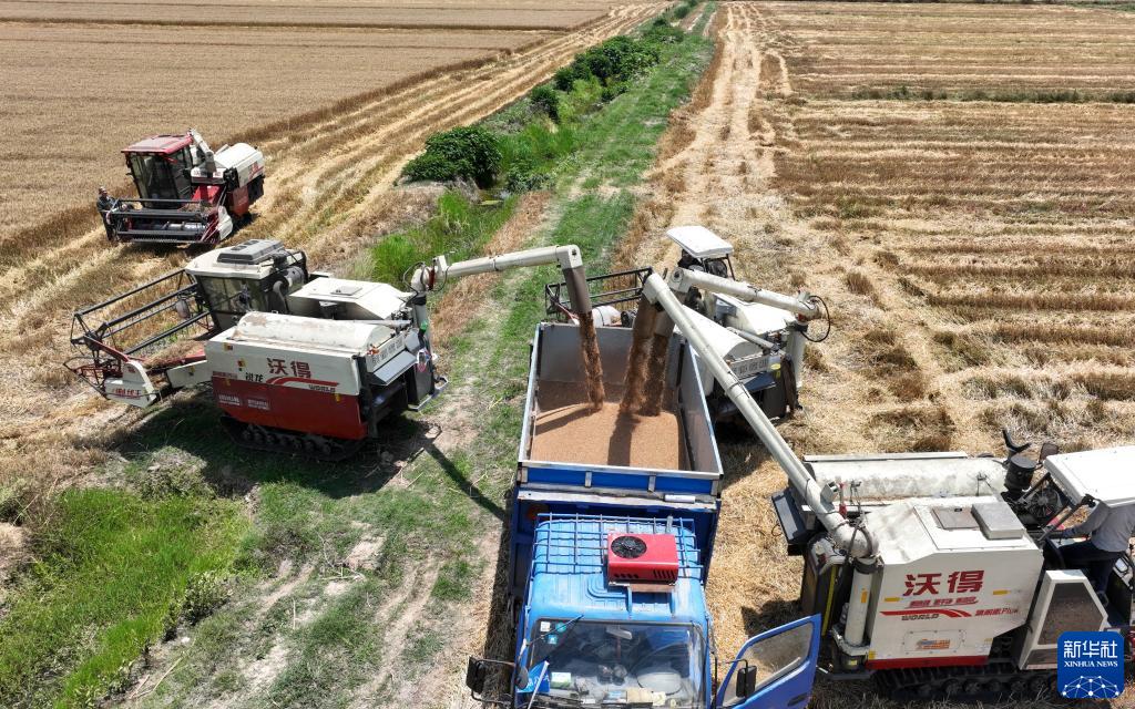 6月2日,在江蘇省淮安市洪澤區(qū)三河鎮(zhèn)草橋村麥田里,農(nóng)民駕駛收割機將小麥裝車(無人機照片)。