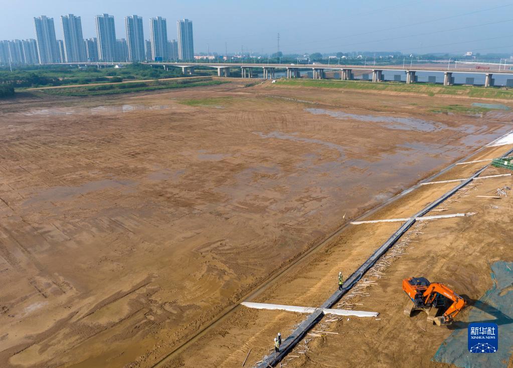6月2日,工人在淮河入海水道二期工程淮安市先導段鋪設護坡(無人機照片)。