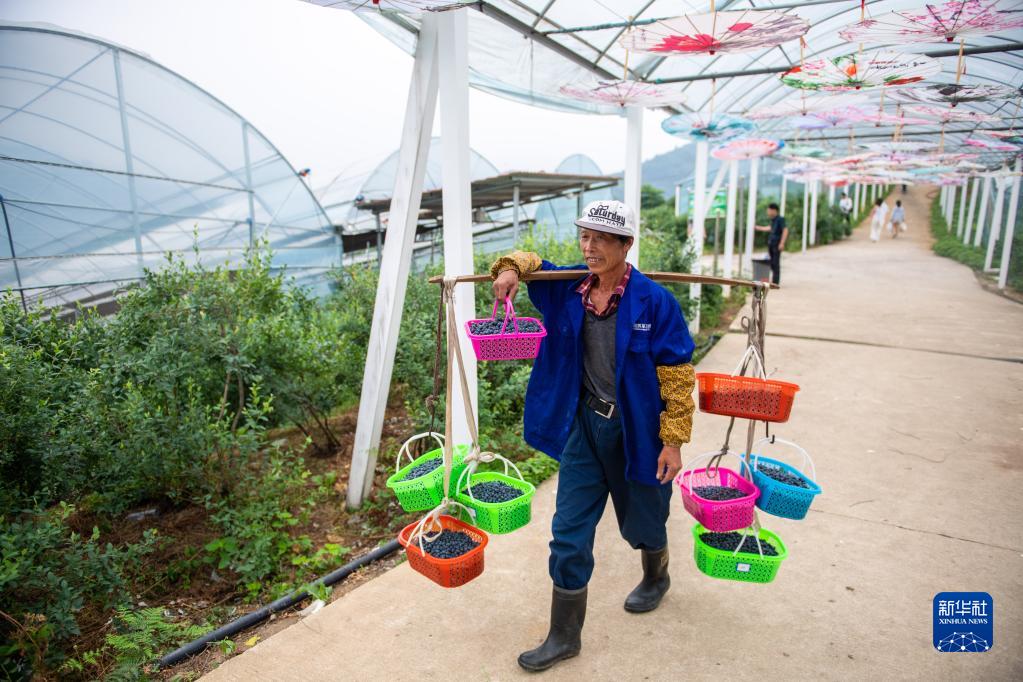 6月3日,在冷水江市金竹山鎮新田村藍莓基地,果農運輸準備銷售的藍莓。