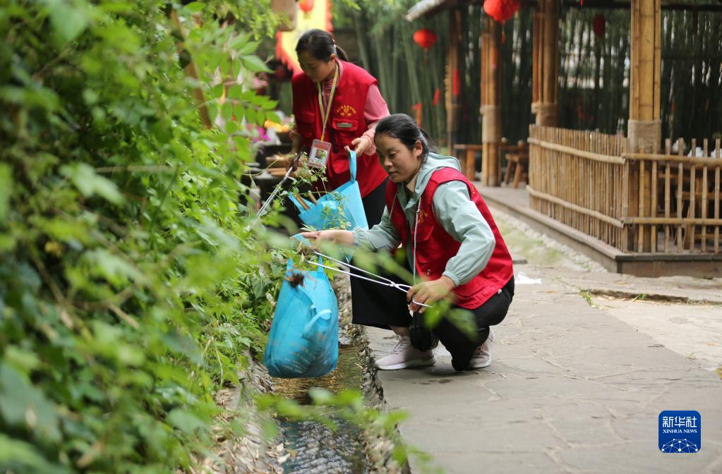 6月3日,在山東省臨沂市沂南縣竹泉村景區,參加志愿環保活動的志愿者在撿拾垃圾。