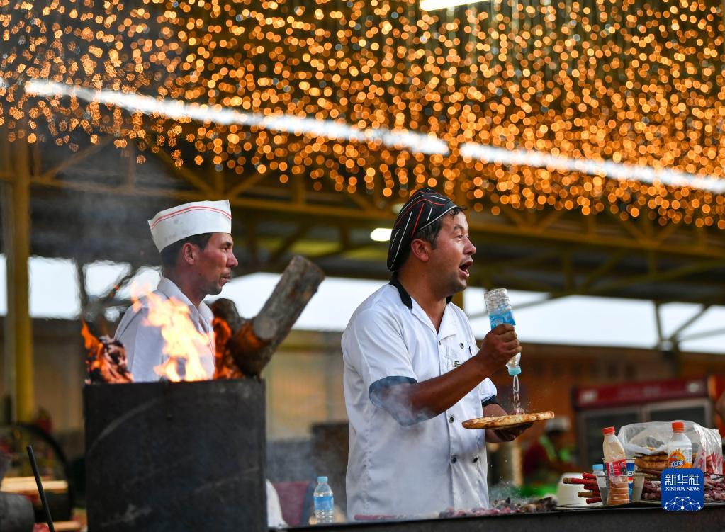5月22日,燒烤攤主在新疆喀什地區麥蓋提縣N39°沙漠旅游景區的美食廣場上熱情吆喝。2023年環塔拉力賽期間,該景區專門設置了多個美食攤位,滿足參賽人員、游客的消費需求。